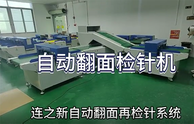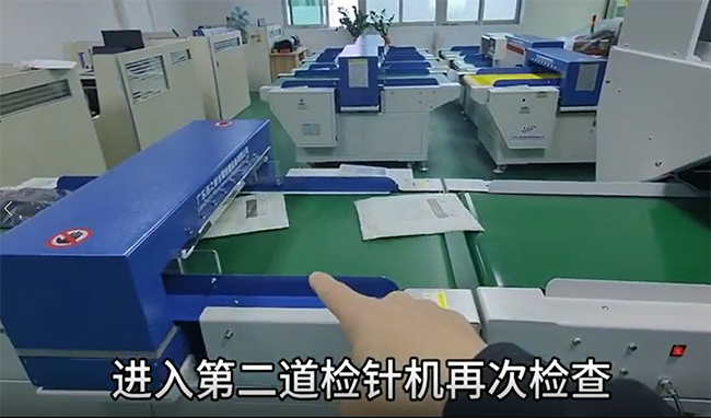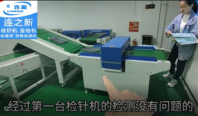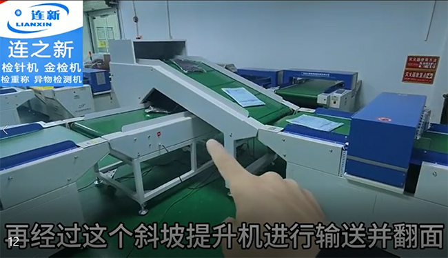 把衣服放進(jìn)檢針機(jī),經(jīng)過第一臺檢針機(jī)的檢測沒有問題后,再經(jīng)過斜坡提升機(jī)進(jìn)行輸送關(guān)翻面,翻面后,經(jīng)過輸送機(jī)輸出,進(jìn)入第二道檢針機(jī)再次檢查。