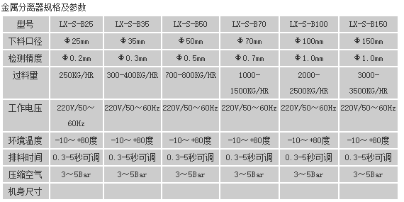 原料從料斗或送料器自由下落進入金屬分離器,如果沒有金屬雜質,原料會直接通過金屬分離器流向下端的出料口。如果檢測器檢測到原料中含有金屬,那么控制器立刻啟動分離板將金屬物和部分原料一起導向側面的排料口,然后分流板迅速恢復至正常的位置,分流板速度可調,金屬分離器的檢測精度也可根據生產需要調節(jié),最小可檢測并分離出Φ 0.2mm的金屬顆粒。